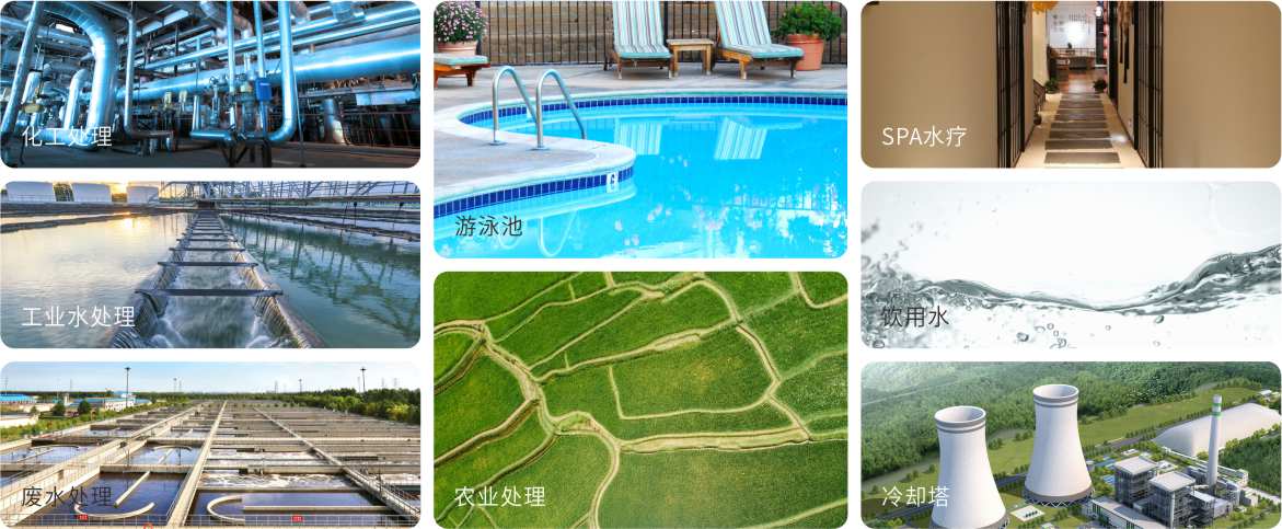 用于各类型亚洲91麻豆又大又粗又黄、SPA水疗、工业水处理、冷却塔、饮用水、废水处理、农业等水处理领域。